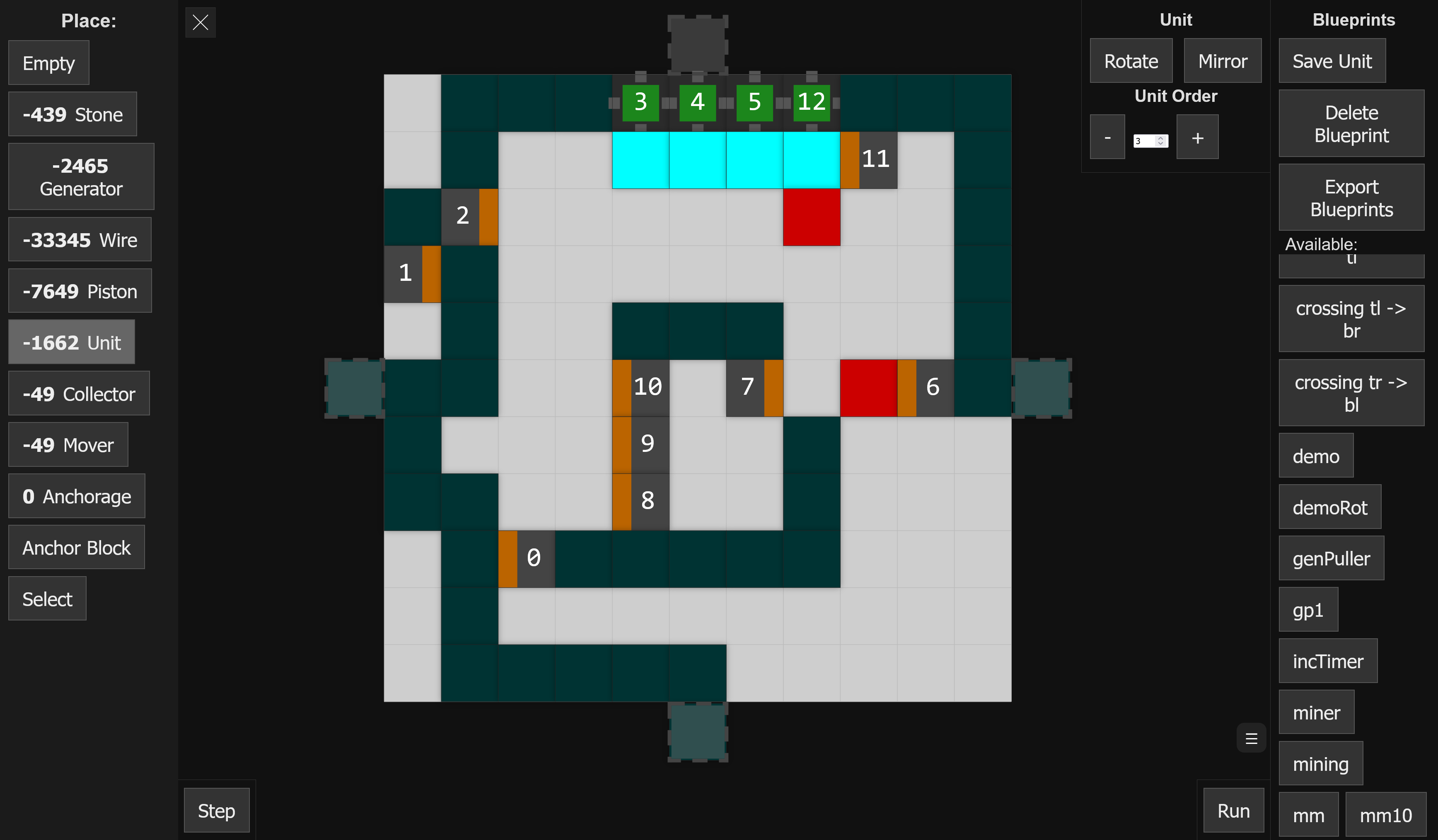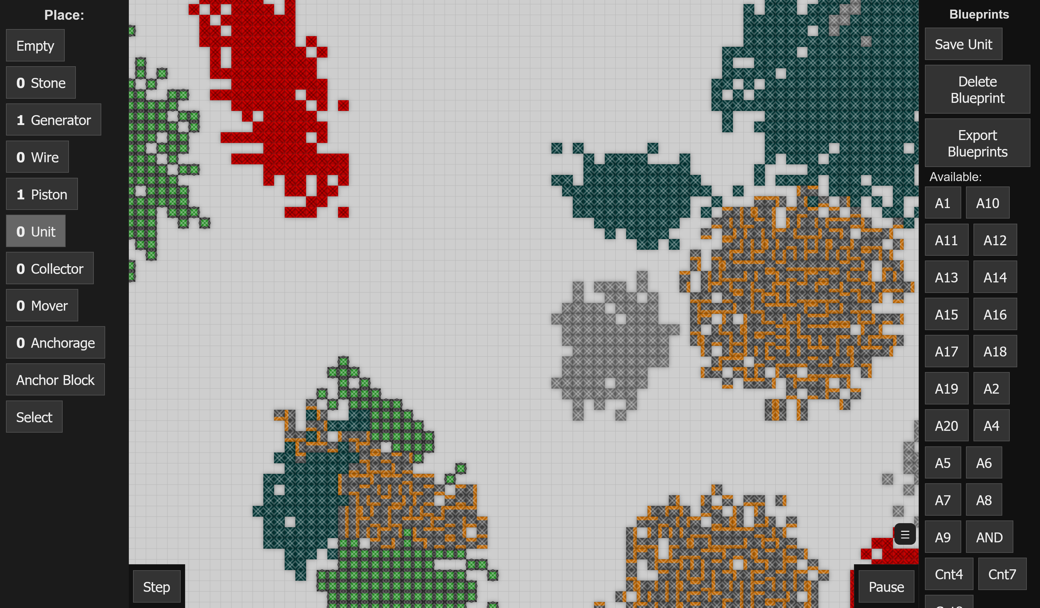 - 50 bit sequencer: a single unit that can receive, hold and dispense a sequence of 50 consecutive blocks in order. It consists of about 1000 blocks and has up to 4 levels of nested units (excluding the parent unit). I am sure, this can be built more efficiently. Right now I am designing a mechanic that is able to duplicate the sequence read from an existing sequencer. The duplication mechanism already works. I am still working on the recovery mechanism, that transports the needed resources into the duplication mechanism. The duplicator already has more than 3000 single blocks.
