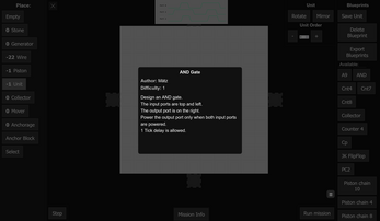 It'd also be a decent game if the missions followed the nandgame path but with a focus on utilizing the different in/output for varying scenarios. A more tactile approach to the rather stale ones out. Given each map has large open spaces, there's enough room to hard-code in a sort of tutorial zone like a mechanics display where the player completes each step as a mission. At the end they have a line of contraptions that show what each component is does at a glance.
